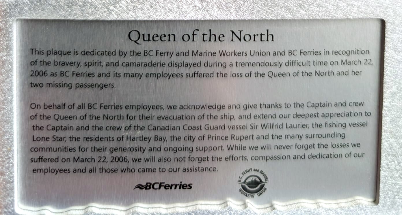 On March 22, 2006, the Queen of the North struck Gil Island in Wright Sound and sank in the early hours of the morning. Of the 101 passengers and crew on board, 99 survived. Two passengers, Gerald Foisy and Shirley Rosette, were never found.